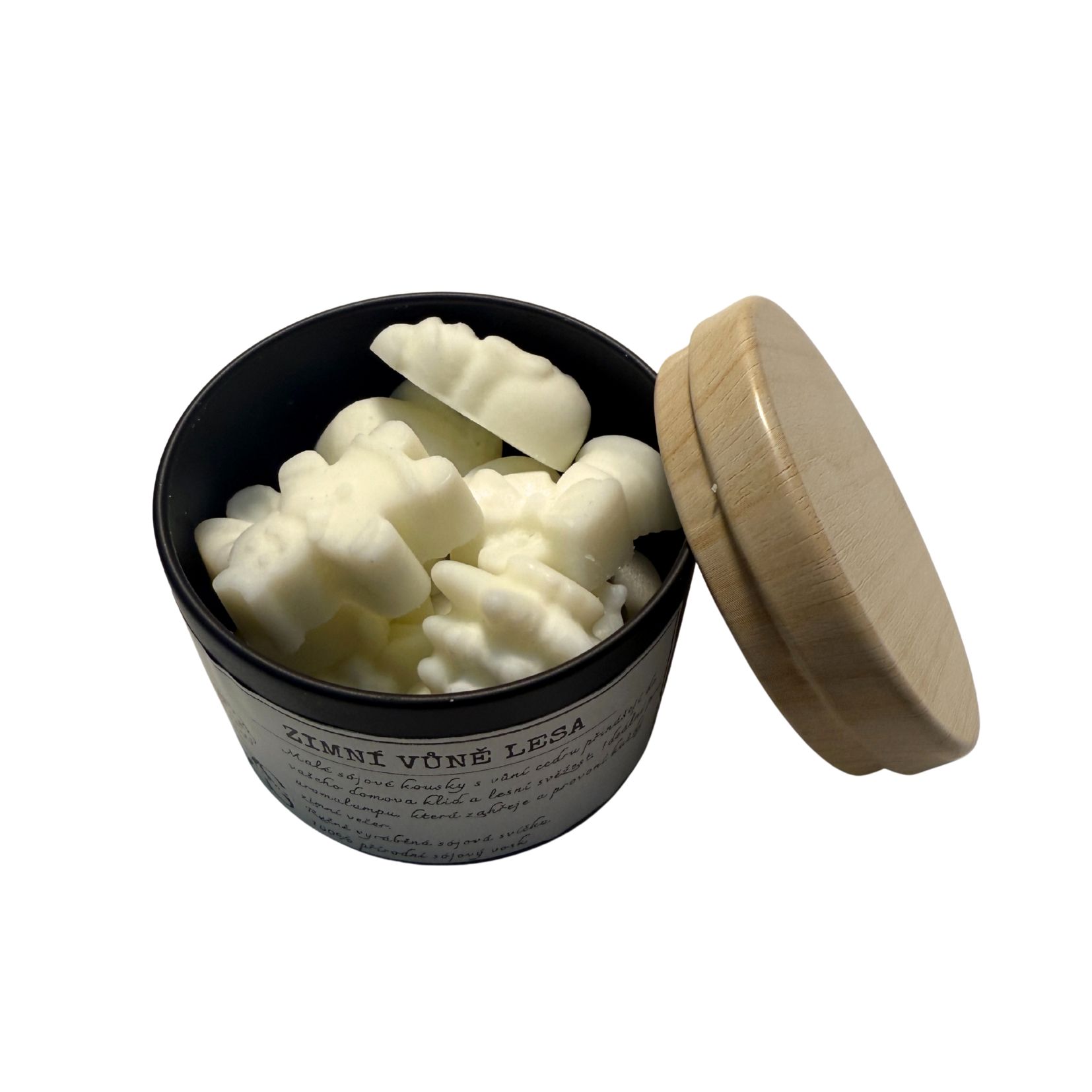 - Balení: Vosky jsou uloženy v elegantní černé plechové krabičce s plechovým víčkem v dekoru dřeva. Toto balení je nejen praktické, ale také stylové, ideální jako dárek.